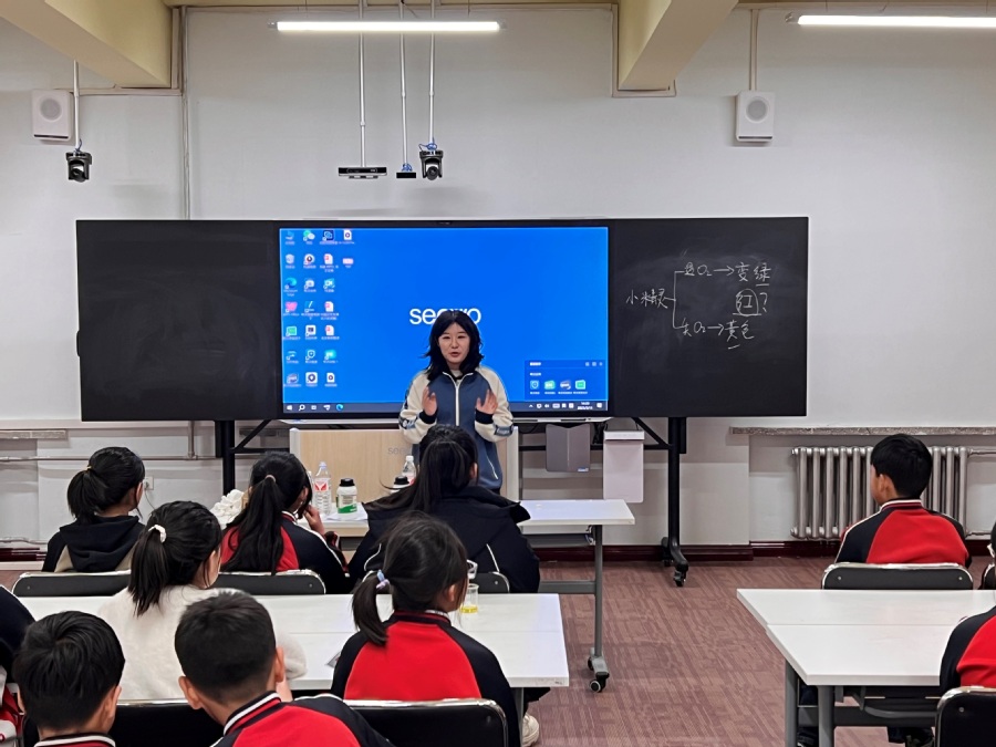 实验课堂上,志愿者讲师张丁旖、雷晓艺为五年级学生演示了“荧光鲁米诺”与“瓶中红绿灯”两个精彩的化学实验。两位讲师通过鲁米诺试剂在氧化反应中产生蓝色荧光现象,讲解化学发光原理;借助亚甲基蓝溶液在震荡后产生颜色循环变化,阐释氧化还原反应过程。在讲解安全注意事项后,学生们分组进行实验操作,观察记录反应现象。实验结束后,志愿者为学生们发放了小礼品,勉励大家保持对于科学探索的热情。