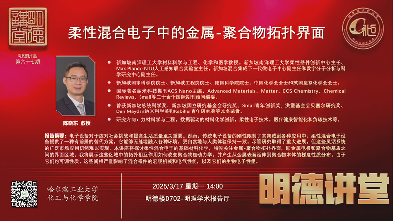 3月17日下午,太阳成城集团tyc234cc“明德讲堂”第六十七期在明理学术报告厅成功举办。新加坡南洋理工大学材料科学与工程、化学和医学教授陈晓东受邀作题为“柔性混合电子中的金属-聚合物拓扑界面”的学术报告。活动由学院党委书记刘光惠主持,近40位师生现场参与。