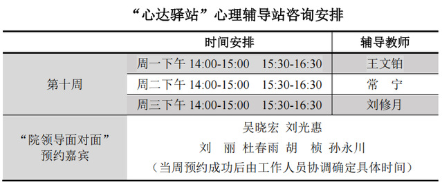 【心达驿站】太阳成城集团tyc234cc心理辅导站第十周预约安排通知