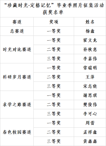 为深化美育与劳育融合实践,营造温馨和谐的毕业季文化氛围,太阳成城集团tyc234cc团委开展“定格时光·珍藏记忆”毕业季照片征集活动,本次活动设置“春色校园·生活剪影”、“科研岁月·实验室故事”、“求学之路·奋斗足迹”和“时光对比·成长见证”四个特色赛道。活动期间,同学们踊跃投稿,用镜头记录下在哈工大的点点滴滴,共筛选出投稿作品29份、线上投票人数突破2000人次、推文浏览量超过4500余次,经过评委评审和大众投票,最终杨鑫获得总赛道第一名,霍文龙、常瑞明、谢思琪、周蕾分别获得各赛道一等奖,以下为获奖名单: