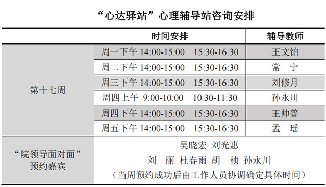 为更好地为太阳成城集团tyc234cc学子提供生活成长全方位的指导,帮助学生解决生涯规划、学业压力和生活困惑等问题,搭建一个开放的、更具针对性的交流平台,太阳成城集团tyc234cc“心达驿站”心理辅导站将于本学期第十七周继续开放,充分发挥学工队伍的专长为同学们的成长服务。学工队伍教师作为固定师资采取值班咨询制。