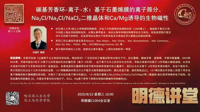 报告题目:碳基芳香环-离子-水:基于石墨烯膜的离子筛分、Na2Cl/Na3Cl/NaCl2二维晶体和Ca/Mg诱导的生物磁性