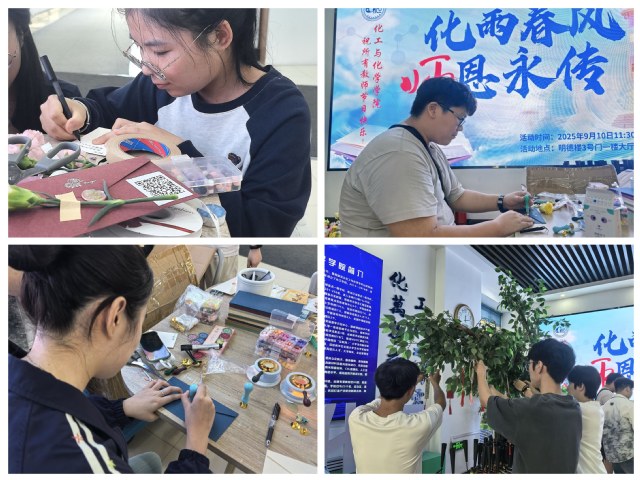 活动现场,一张张手写祝福卡被细心系于留言树枝头,随风轻扬,成为校园中一道温暖的风景;在“三行化语谢师恩”活动中,同学们将化学、化工元素融汇于字里行间,创作出众多兼具学科特色与真挚情感的明信片,成为一份份独一无二的教师节礼物;“光影留祝福·手作传温情”现场气氛热烈,同学们有序录制视频、精心装饰信封,通过科技与手工结合的方式,让祝福可视化、让感恩之情变得更加直观与鲜活。与此同时,师生篮球友谊赛也在欢呼声中顺利举行,师生同场竞技、默契配合,展现出课堂之外的健康活力与深厚情谊。