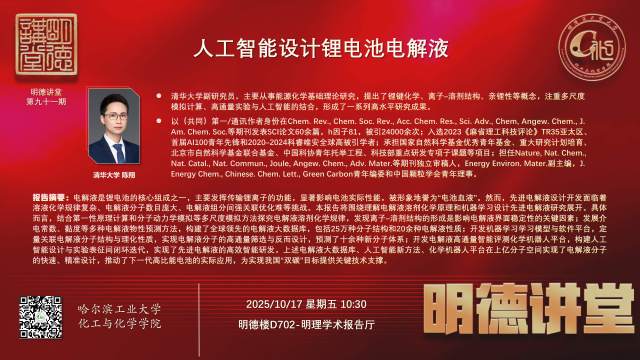 电解液是锂电池的核心组成之一,主要发挥传输锂离子的功能,显著影响电池实际性能,被形象地誉为“电池血液”。然而,先进电解液设计开发面临着溶液化学规律复杂、电解液分子数目庞大、电解液组分间强关联优化难等挑战。本报告将围绕理解电解液溶剂化学原理和机器学习设计先进电解液研究展开。具体而言,结合第一性原理计算和分子动力学模拟等多尺度模拟方法探究电解液溶剂化学规律,发现离子–溶剂结构的形成是影响电解液界面稳定性的关键因素;发展介电常数、黏度等多种电解液物性预测方法,构建了全球领先的电解液大数据库,包括25万种分子结构和20余种电解液性质;开发机器学习学习模型与软件平台,定量关联电解液分子结构与理化性质,实现电解液分子的高通量筛选与反而设计,预测了十余种新分子体系;开发电解液高通量智能评测化学机器人平台,构建人工智能设计与实验表征间闭环迭代,实现了先进电解液的高效智能研发。上述电解液大数据库、人工智能新方法、化学机器人平台在上亿分子空间实现了电解液分子的快速、精准设计,推动了下一代高比能电池的实际应用,为实现我国“双碳”目标提供关键技术支撑。
