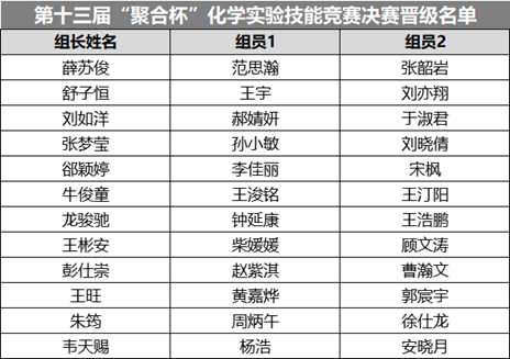 根据《第十三届“聚合杯”化学实验技能竞赛通知》的要求,经过笔试环节筛选,共有12组晋级。