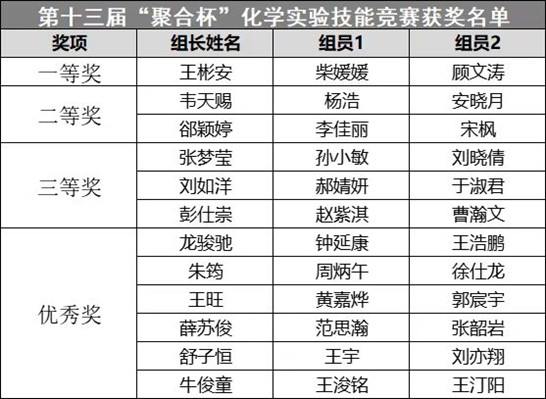 根据《第十三届“聚合杯”化学实验技能竞赛通知》的要求,笔试成绩与实验成绩综合评分,共有12个小组获奖。现将具体获奖名单公布如下: