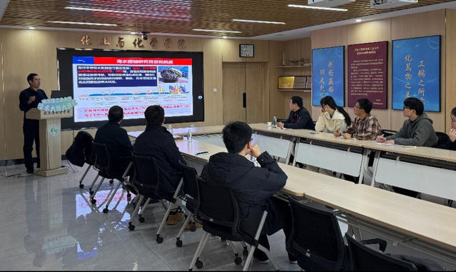 王君教授系统介绍了其团队在海水提铀领域的长期研究进展。针对海水提铀材料普遍面临的海洋生物污损难题,其团队围绕材料抗污损设计及海试验证开展了深入研究,推动海水提铀技术从实验室迈向工程化应用。王君教授团队针对海洋生物黏附机制,以及海水中铀离子浓度低、竞争离子多、材料pKa与海水pH不匹配等关键问题,通过引入防污活性基团、构筑表面水化层等手段,使吸附材料兼具抗污损性与高效提铀性能,为解决工程化过程中的多因素耦合挑战提供了新的技术路径。在交流环节,现场师生积极提问,王君教授结合多年科研经验逐一作出深入解答,讨论氛围热烈,展现了高水平的学术互动。