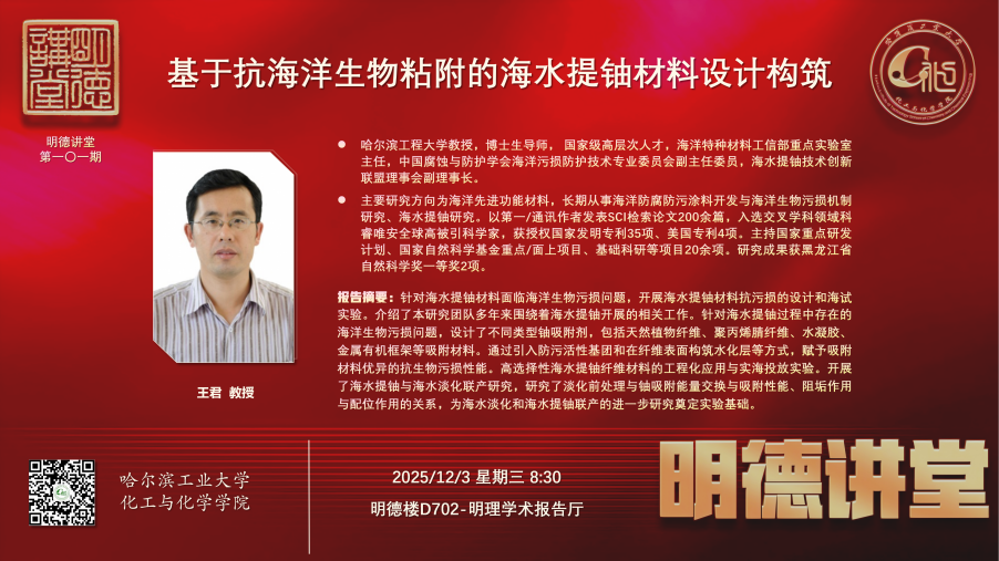 12月3日上午,太阳成城集团tyc234cc“明德讲堂”第一百零一期暨“学术大师大讲堂”第二十二期在明理学术报告厅成功举办。哈尔滨工程大学材料科学与化学工程学院王君教授应我院材料化学系姚忠平研究员邀请,作题为“基于抗海洋生物粘附的海水提铀材料设计构筑”的学术报告。本次活动由姚忠平研究员主持,近20位师生现场参会并积极交流。