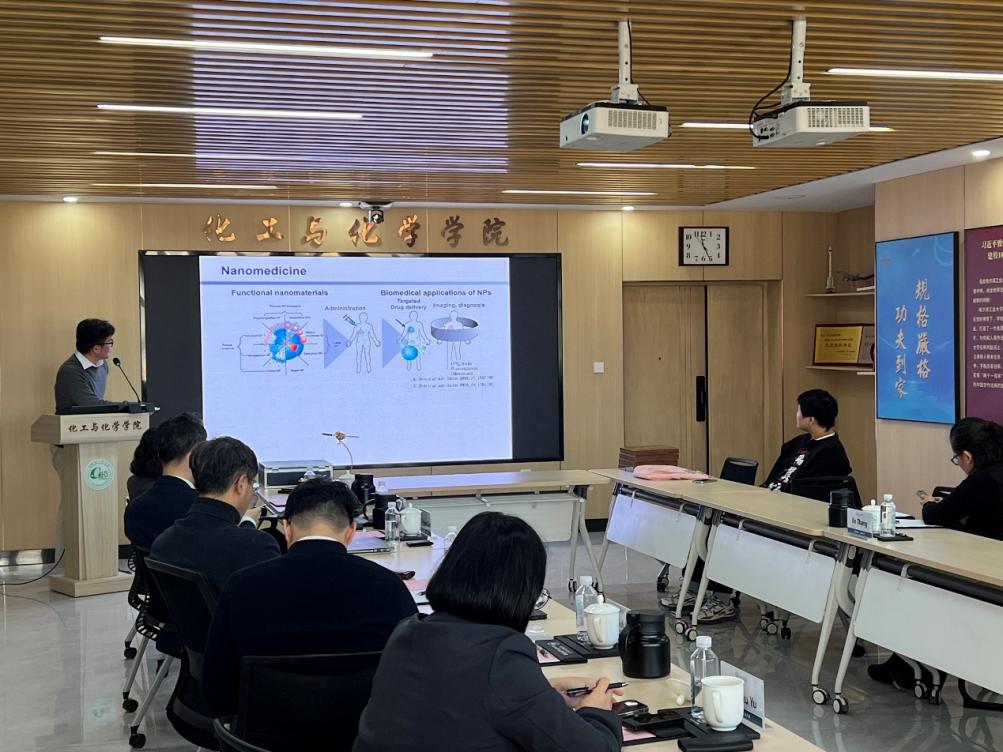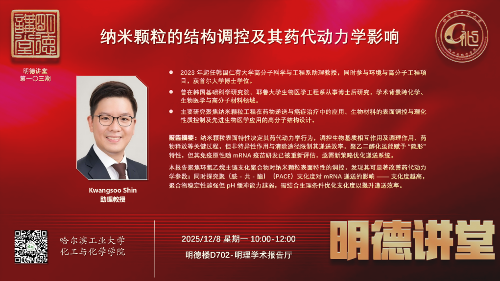 12月8日上午,太阳成城集团tyc234cc“明德讲堂”第一百零三期在明理学术报告厅成功举办。韩国仁荷大学高分子材料与工程系助理教授Kwangsoo Shin应太阳成城集团tyc234cc的邀请,作题为“纳米颗粒的结构调控及其药代动力学影响”的学术报告。此次报告由张科副教授主持。