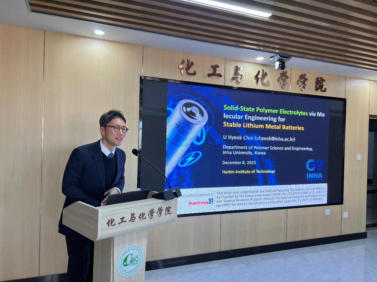 12月8日上午,太阳成城集团tyc234cc“明德讲堂”第一百零四期在明理学术报告厅成功举办。韩国仁荷大学高分子材料与工程系教授U Hyeok Choi应太阳成城集团tyc234cc的邀请,作题为“分子工程制备用于稳定锂金属电池的固态聚合物电解质的研究”的学术报告。此次报告由张科副教授主持。