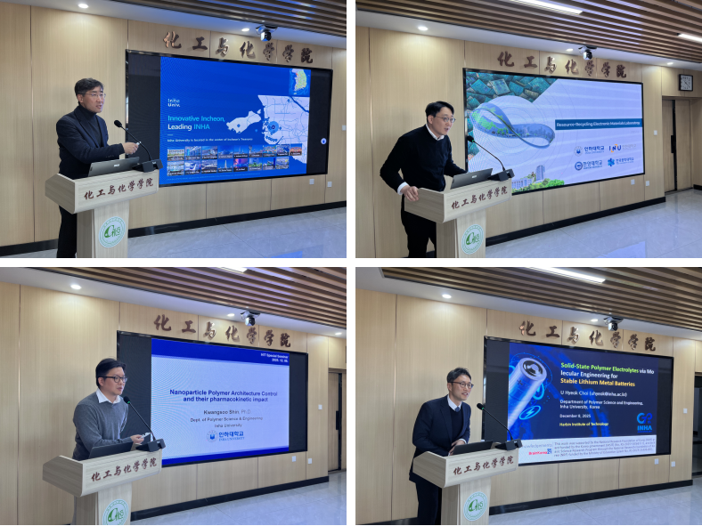 交流期间,双方围绕化学化工领域热点议题举办学术研讨会。Yong Ku KwonU Hyeok Choi等四位仁荷大学学者分别就各自研究领域的最新成果作专题报告,内容涵盖先进功能材料研发、环境友好型催化技术、生物医学材料应用等前沿方向,展现了韩国在相关领域的前沿探索与技术突破。学院与会教师也结合自身研究方向作学术分享,双方就研究方法、技术路径及未来合作模式等展开热烈讨论,现场学术氛围浓厚。