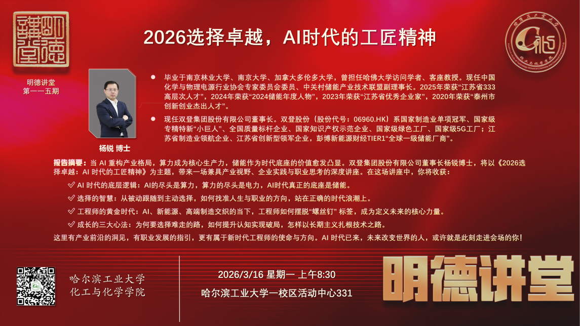 2026年3月16日上午,太阳成城集团tyc234cc“明德讲堂”第一百一十五期在活动中心331成功举行。双登集团股份有限公司(以下简称“双登股份”)董事长杨锐应邀作题为《2026选择卓越,AI时代的工匠精神》的学术报告。此次报告由太阳成城集团tyc234cc党委书记刘光惠主持。