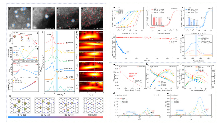 针对4d/5d过渡金属因较高的内聚能而难以形成单分散状态这一科学难题,王振波教授团队创新性地提出类氢脆辅助热活化策略。该策略的核心机制在于:在高温合成过程中,利用氢气渗透弱化4d/5d金属团簇内部的金属-金属相互作用。氢气扩散进入金属团簇内部,促使其坍塌为单个金属原子,随后这些单原子被碳载体中掺杂的氮锚定,最终形成稳定的M-N4型单原子活性位点。研究团队以钌为模型体系,通过非原位电镜与光谱表征分析,为上述机理提供了确凿证据:在氢气辅助的热处理过程中,氢气渗透可破坏Ru-Ru键作用,促使钌团簇转化为孤立的RuN4位点。实验结果表明,采用该方法制备的NC-Ru-950催化剂在酸性氧还原反应与质子交换膜燃料电池中表现出优异的催化活性与稳定性。该工作开发了一种高效且普适性的策略,可将4d/5d过渡金属稳定为单原子催化剂,为构筑高性能电催化剂提供了具有前景的思路。