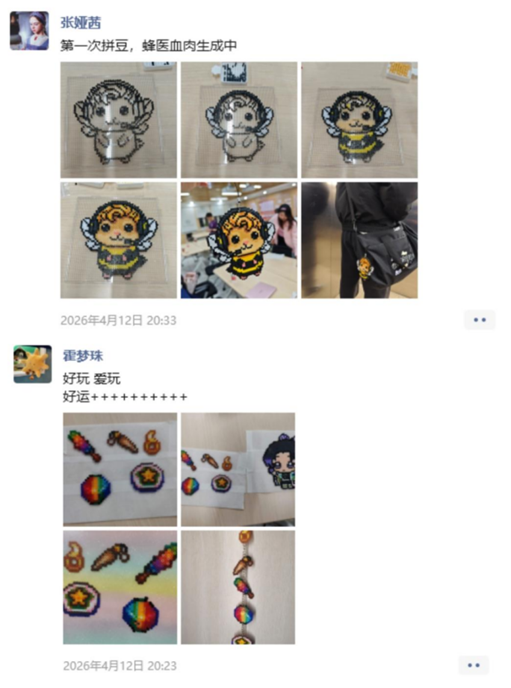 巧手生趣,豆粒成画。一件件生动鲜活的作品在同学们的指尖次第绽放:色彩明丽、层次分明的美味蛋糕令人垂涎,憨态可掬的小蜜蜂翅膀轻振、条纹栩栩如生,形态各异的Hello Kitty粉嫩可爱,童趣盎然。活动落幕,同学们纷纷在社交平台晒出自己的拼豆作品,分享专注创作带来的喜悦与成就感,彼此的情谊也在指尖的交流中悄然升温。