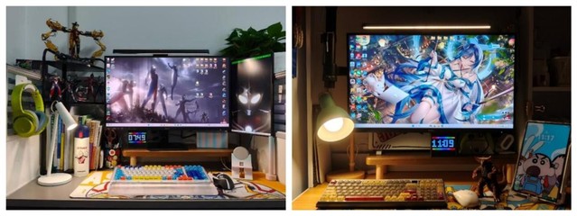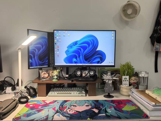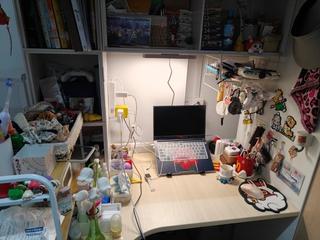 宋子涵同学将工位与宿舍书桌打造成舒适的理想空间:工位双屏搭配3D打印收纳,秩序井然、高效实用,辅以模型与绿植增添生机;宿舍书桌以暖光与统一审美营造沉静氛围。两处空间相互呼应,兼顾工作效率与生活气息,实现功能与情绪的自然转换,尽显成熟的空间把控与自我关照。