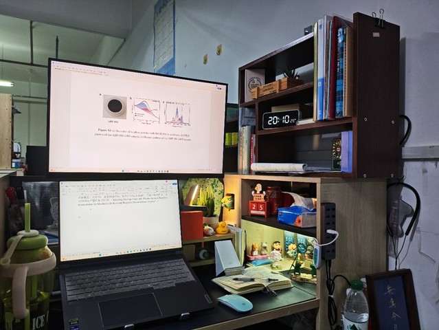 刘禹同学的书桌兼具理性秩序与感性温度。原本杂乱的空间被重构为层次分明、功能清晰的高效科研区,多屏协同与合理外设布局尽显高效实践能力。他以绿色为主调统一视觉,搭配长寿花、笑脸桌垫与励志标语,在实用之外注入审美与精神力量,营造松弛科研氛围,让工位成为生活态度的具象表达。