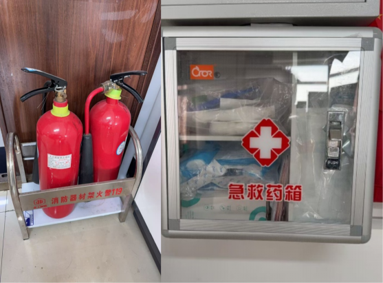 急救药箱、灭火器等应急设施定点摆放,定期点检