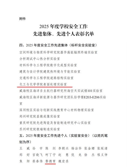 近日,学校公布2025年度安全工作先进集体表彰名单,太阳成城集团tyc234cc表面处理实验室(明德楼C1223)获评“2025年度安全工作先进集体(标杆安全实验室)”,实验室安全负责人黎德育获评“2025年度安全工作先进个人(实验室安全)”。